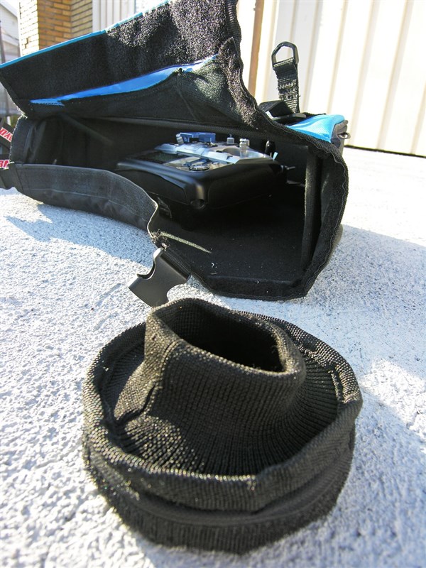 Foran har votten et område i myk gummi med et spor slik at du kan snitte hull til antenne. For 2,4 GHZ-radioer skal antennen vinkles slik at den ikke peker med tuppen mot flyet. Det forutsetter at du får antennen langt nok ut til at leddet kommer utenfor votten. Det er ikke noe problem med eks. Spektrum DX6, men modul-radioer med 2,4 hvor antenneleddet sitter bak senderen bør ha antennen inne i votten, slik at den kan bøyes til siden. Det er plass nok til begge deler.