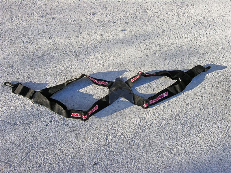Stroppen som skal festes rundt livet er kuriøst nok for lang selv med justering, så den måtte jeg lage en liten knute på for at den skulle bli stram. Den behøver heller ikke brukes, for med skulderreim sitter votten så godt på kroppen at du ikke trenger ytterligere faststropping.