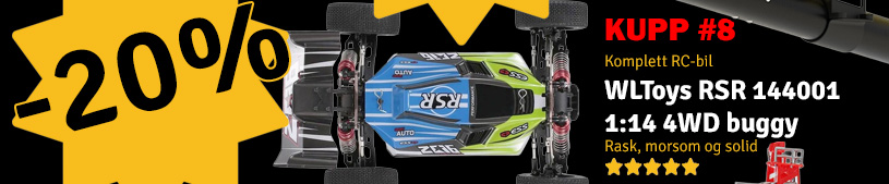 WLToys Buggy RSR i 1/14-skala i grønn utgave med 4WD. Meget rask bil med mye bruk av solide aluminiumsdeler. Leveres komplett med oppladbart LiPo-batteri og 2.4GHz rattradio. Bilen er 31cm lang og har en toppfart opp mot 50km/h. Det følger med lader