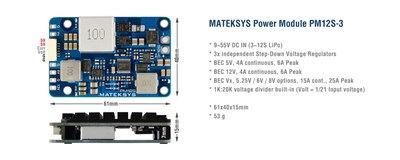PM02D gir regulert strømforsyning til Pixhawk 5X og 6X fra batteriet, samt strømforbruk og batterispenningsmålinger, alt gjennom en 6-pinners kabel. Den innebygde bryterregulatoren gir ut 5,2V og maksimalt 3A fra LiPo-batterier opptil 12S (HV). Strø