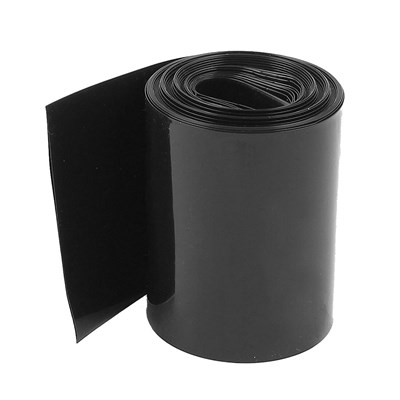 Svart krympeplast i PVC på 1 meter, bredde målt flatpresset. Krympeplasten er beregnet for bruk på f.eks batteripakker.