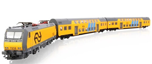 Komplett startsett med tog, skinner og trafo. Togsettet inneholder et E-lok med to dobbeldekker personvogner i skala H0(1:87). Medfølgende skinner gir en stor ovalbane med alternativspor. En perfekt start for å komme i gang med modelljernbane.