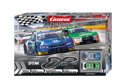 Analog bilbane i 1:32 skala med BMW M4 og Audi RS5 i DTM-versjoner. Alle banene evolution-serien til Carrera inneholder bane deleri 1:24-skala og biler i 1:32-skala for enda bedre plass og boltre seg på. Banelengde på 6.3m med varierte kurver og en bro. Håndkontrolleren har trinnløs gass.