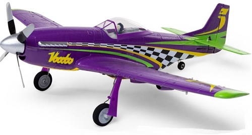 The P-51D Mustang is one of the most popular and iconic fighter aircraft of all time! Its unique design resulted in it delivering some of the best performance among all fighter aircraft flown in WWII. Because of that incredible performance, even today, many P-51s are still being flown in airshows and air races around the world. "Voodoo" is a modified P-51D Mustang that won the Unlimited Class at the Reno Air Races in 2013, 2014, and 2016. Its unique trim scheme is highly recognizable yet is rarely replicated on RC models. The E-flite UMX P-51D Voodoo is an ultra-micro version of the famous racer based on an updated and upgraded version of the original UMX P-51D BL thats even easier and more fun to fly than ever before! Its now equipped with optional-use SAFE Select, is 2S and 3S-compatible, and provides real-time battery voltage telemetry to compatible transmitters. Because of its ultra-micro size, the UMX Voodoo can be flown in more places and smaller spaces, including many yards, parks, and sports fields! The fixed landing gear with a steerable tailwheel makes it easy to taxi, takeoff from, and land on smooth surfaces, or you can leave the landing gear off for more speed and vertical performance with easy hand launches over and landings on grass. Its the most affordable, convenient, and easiest-to-fly replica of a P-51 racer yet!