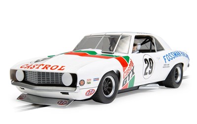 Scalextric Chevrolet Camaro - Castrol Racing Trans Am 1971. Dette er en bilbanebil i 1:32 skala og beregnet for bruk på Scalextric analoge 1:32 bilbaner, eller tilsvarende bilbanesystemer. Bilen kan digitalt konverteres ved bruk av digital plugg. Bi