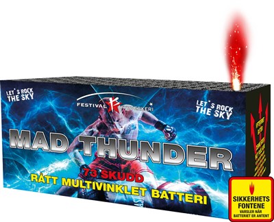 10% rabatt ved reservasjon t.o.m. 28. desember. Bruk rabattkode: GodtNyttÅr Rått multivinklet batteri med 4 forskjellige skytemønster. Fargekombinasjoner i sølv, gull, lilla og blått. mad Thunder har kule pal
