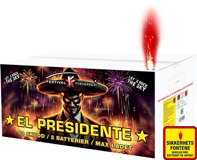 10% rabatt ved reservasjon t.o.m. 28. desember. Bruk rabattkode: GodtNyttÅr El Presidente består av to batterier som er slått sammen til et. Denne kraftpakken byr på 140 sekunder med masse variasjon og 50 sku