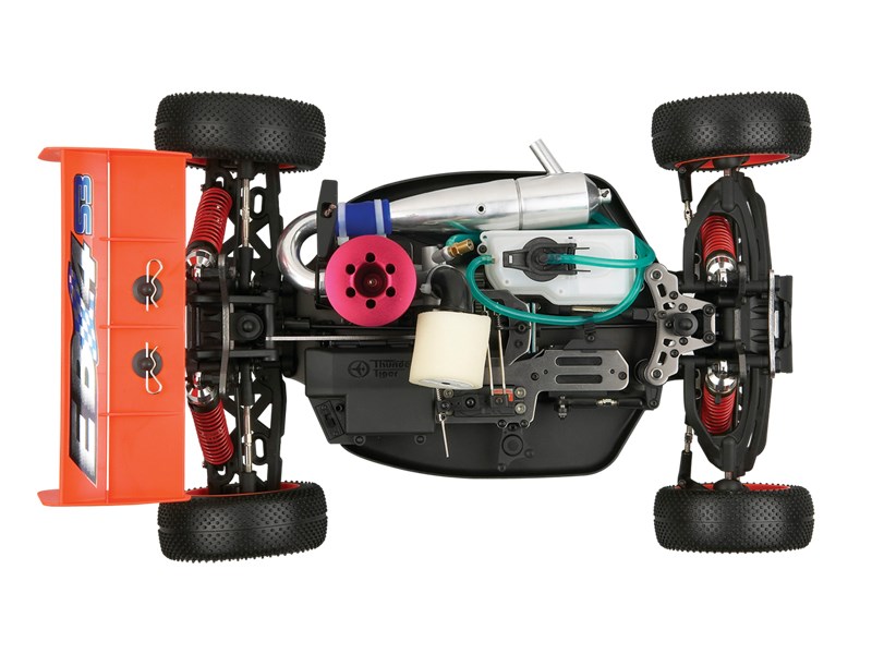 Anodized chassis with narrow configuration for stable handling Easily adjustable front pivot-ball suspensionFull metal oil-filled shocks with large volume anodized shock bodiesThunder Tiger PRO-28 ball-raced pullstart engine with slide bodiesDual stage air cleanerPolished CNC machined aluminum tuned pipe and manifold3 small-lightened gear differentials with constant shaft driven 4WD designDual metal brake discHeavy duty CVD universal front drive trainLightened and small size flywheelAnodized alloy front brace, radio tray and center differential top plateEnclosed dust-resistant radio & battery boxLaid down steering servo for low center of gravityCaptured hinge pins do not require retaining clipsComplete set of rubber-sealed ball bearings includedWheels, printed polycarbonate body and one piece nylon wing all included