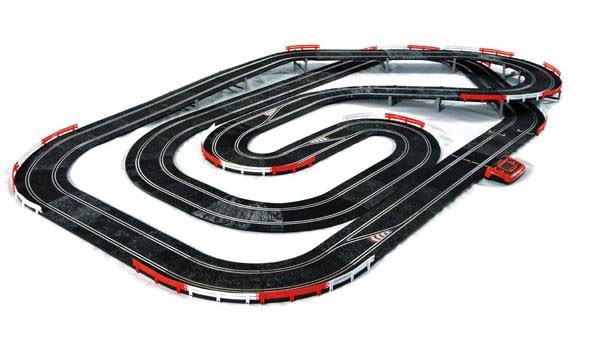 • Digital Master Track Set with 46+ feet of track, four lane change tracks, three decoder chips, digital console, three hand controllers and power supply. Comes with enough components to race up to three cars at the same time. Can be expanded to up to 8 cars by purchasing additional hand controllers and decoder chips.