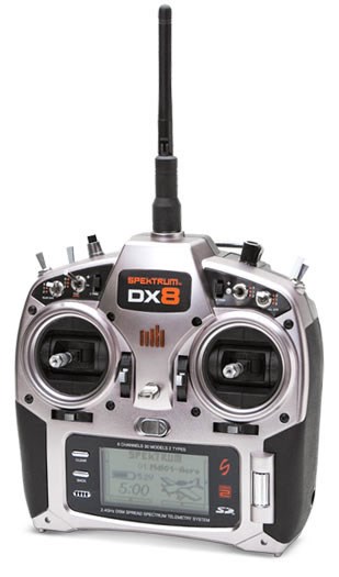 Dette er Spektrum DX8 med telemetri og 8kanals high-speed mottaker! En radio i verdensklasse som kan brukes til fly, helikopter og enkle seilfly. Det følger med TM1000 Full range telemetrimodul som kan gi real-time flightlog data om mottakerspenning, batterispenning, turtall og temperatur. Videre er det med 2000mah sendebatteri og 230V lader til dette, nakkestropp, 128mb minnekort og 8ch 2048 mottaker. Radioen er god å holde i og man har god plass til en finger imellom bryterne på toppen ( viktig spesielt for helifolket ). Skjermen er stor og menyene er lett å navigere i. Stikkene er gode å holde i og man kan lett justere motstanden gjennom to luker bak på radioen. Det er digitale trimmer på alle ror og radioen er generelt god å holde i og å bruke.