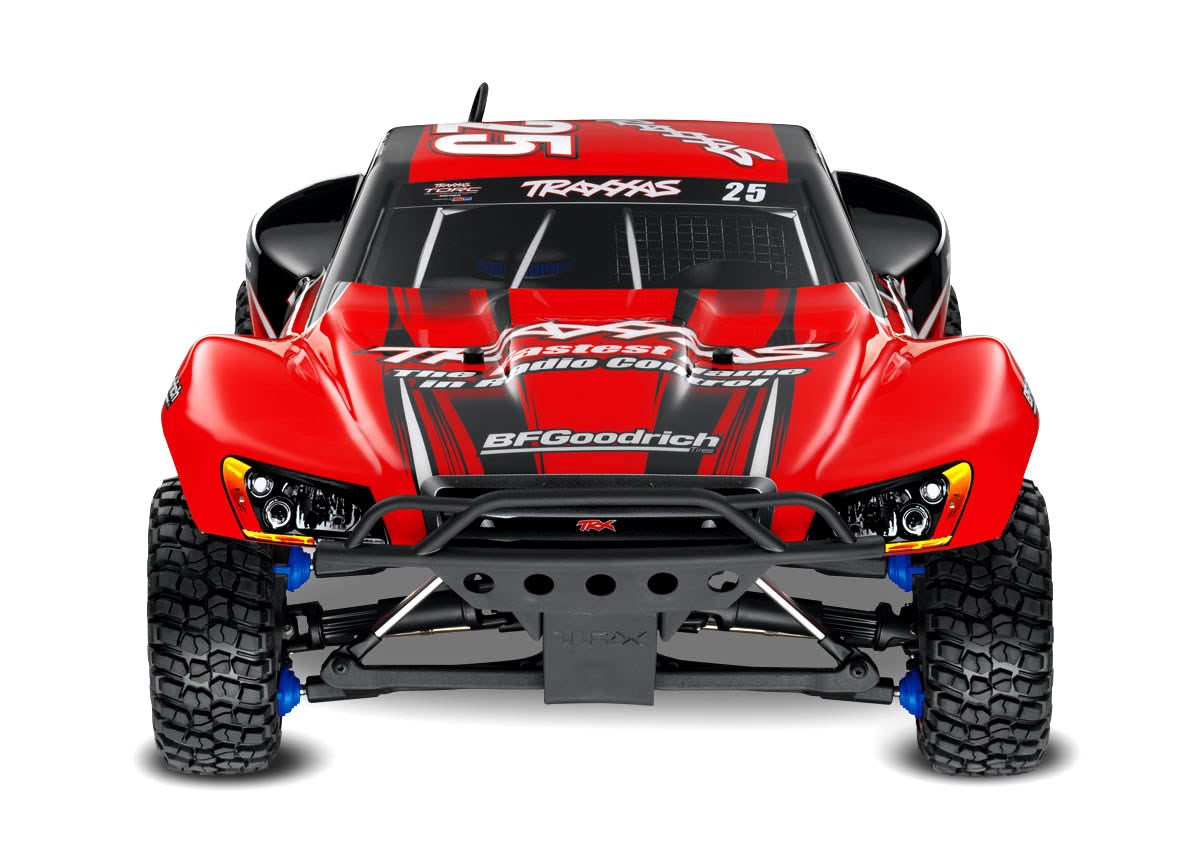 Bigger. Faster. Louder. The new Slayer Pro 4X4 delivers the screaming sound and ballistic thrust that every nitro driver craves. Now with a 10% larger footprint, Slayer Pro 4X4s new longer wheelbase chassis and wide track stance deliver enhanced stability in rough conditions and radically improved high speed cornering for incredible side-by-side, fender-banging racing action. Extreme TRX 3.3 power punches hard and revs fast to rip past the competition. The amazing Revo-Spec linkage-based suspension and hard-anodized GTR shocks deliver seemingly bottomless suspension travel that simulates the handling and jumping ability of full-size Pro 4X4 trucks. Slayer Pro 4X4?s new bodywork and officially licensed BFGoodrich or Kumho tires bring together scale looks and 50+mph performance for all-day fun, excitement, and competition. Its the nitro short-course truck that could only come from Traxxas, The Fastest Name In Radio Control.