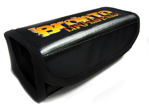 Sikkerhetspose for lading av LiPo. Denne posen anbefales ved lading av LiPo. Ved brann eller stor varmeutvikling vil denne begrense skader og spredning. Du bør fremdeles følge vanlige sikkerhetshensyn når det gjelder håndtering av LiPo, og betrakte dette som en ekstra sikkerhet. Ved lading legges batteriet inn i posen som lukkes godt med en solid borrelås. Ledningene kommer ut gjennom en liten åpning på sidene av borrelåsen.