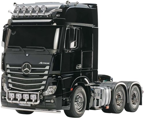This is a highly accurate 1/14 scale radio control model that recreates the Mercedes Benz Actros 3363 3-axle truck. The Actros series debuted in 2011 and was named 2012 Truck of the Year. Powered by a 15.6-liter inline-6 turbocharged diesel putting out a max of 630hp, the actual 3363 can haul up to 250 tons! The Tamiya rendition faithfully captures the truck`s modern form with the use of ABS plastic body parts and a number of metal chassis components. One look at the detailed interior and auxiliary equipment, such as air tanks, will confirm that the body features replica-quality realism, which is further enhanced with metal transfers depicting emblems and numerous metal-plated parts. The chassis is built for durability as it uses aluminum side channels with resin cross members. Drivability is accomplished by power from the front-mounted motor and is transmitted via a propeller shaft to the rear axle; built-in differential gears guarantee smooth cornering. Gear changes can be made via a separately-sold 4-channel transmitter.