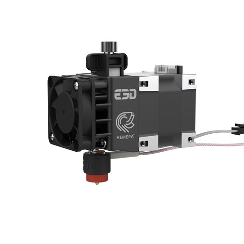 Revo Hemera fra E3D er et kompakt og kraftig ekstruderingssystem med RapicChange (hurtigskiftende) Revo-systemet. Med doble drivhjul i herdet stål griper den filamentet fra begge sider, og gir en eksepsjonell skyvekraft. En slarkefri filamentrute betyr at materialet ikke kan bøye seg på vei til smeltesonen, noe som gjør dette til et toppvalg for utfordrene filamenttyper som er fleksible, f.eks. TPU. Med Revo-systemet kan du enkelt bytte ut dysene for hånd i romtemperatur. Alt du trenger er inkludert i kittet, som vifte, varmekoble, temp-sensor, motor og dyse.