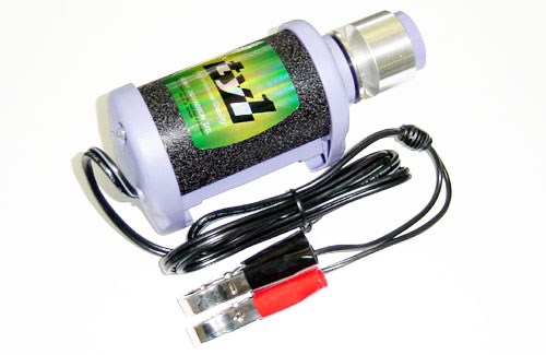 Den bruker 12V inn og gummipropp til munnstykket følger med. Festes til et batteri med krokodilleklemmene.