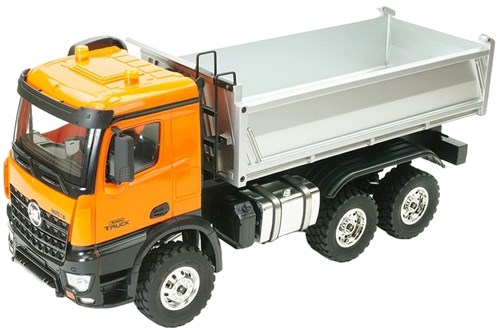 Komplett lastebil i skala 1:14 med lasteplan og hytte i metall og hele 14 funksjoner. Modellen kjører framover/bakover med firehjulstrekk og svinger høyre/venstre samt har skalalik tipping av lasteplanet. Modellen har også lys og og lyd i tillegg til en detaljert førerkabin. Like gøy for voksne som barn. Maskinen leveres komplett med unntak av 4 AA batterier til radioen.