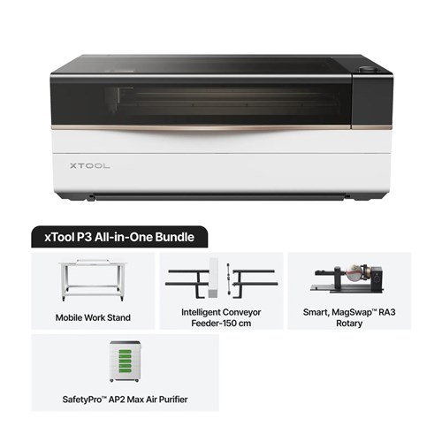 All-in-one bundle inneholder xTool P3 CO2 Laser, RA3 Rotary Attachment for gravering på sylindriske og runde objekter, Interlligent Conveyor Feed for automatisert mating av materialer opptil 3 meter lange, Riser Base som hever maskinen slik at du kan jobbe med større og høyere emner, AP2 Max som er en kraftig luftrenser med filtrering for trygg og ren drift, samt et robust staiv for å få maskinen opp fra gulvet og i riktig arbeidshøyde.