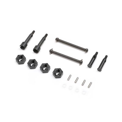 LOS-1764 Drive Shafts, Axles, Wheel Hex Micro-B/T. Dette settet med drivaksler, akslinger og hjulheks inkluderer dogbone, bak-aksler, fram-aksler, drivpinner og 4 hjulheks. Produsert i stål og plastkompositt.