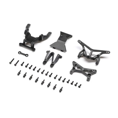 LOS-1770 Front & Rear Towers Bumper Micro-B/T. Inkluderer Fremre og bakre tårn med feste, fremre støtfanger, skruer og kulebolter, laget av plast-kompositt.