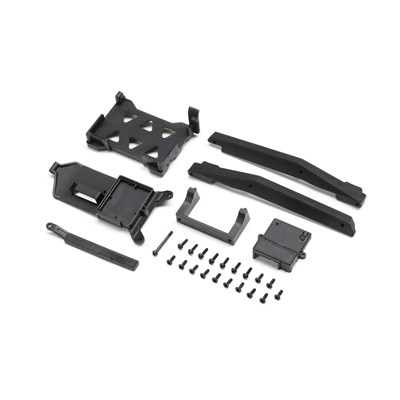 LOS-1772 Chassis Parts Micro-B. Inkluderer side guards, battery-brett, battery feste, ESC mount, ESC case, servo mount og skruer. Laget av plast-kompositt.