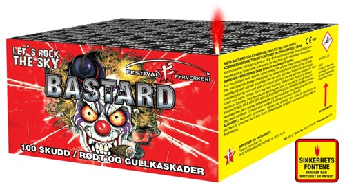 Batteri med høy intensitet og 100 skudd! Bastard har raske avfyriinger, kraftige drønn og kjappe effektskifter i rødt og gull. Batteriet har en varighet på ca. 35 sekunder.