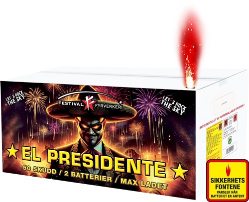 El Presidente består av to batterier som er slått sammen til et. Denne kraftpakken byr på 140 sekunder med masse variasjon og 50 skudd med høyt kaliber. Batteriet er uten tvil kveldens høydepunkt.