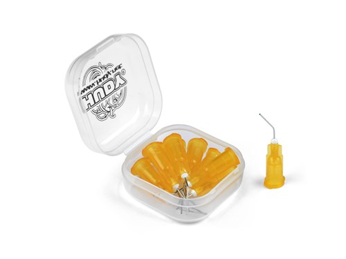 HUDY Glue Tip Needle 0.3mm Orange - Bent (10). Påføringsnåler som gjør det enkelt å dosere små mengder CA-lim nøyaktig der du trenger det. De bøyde, smale nålene gir god kontroll ved detaljarbeid, og leveres i en praktisk plastboks for ryddig oppbevaring.