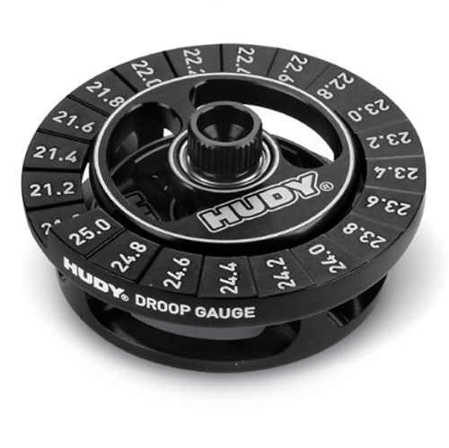 HUDY Droop & Upstop Set-Up Tool. Presis oppsettverktøy for måling av "droop" og "upstop" på RC-biler. HUDY Droop & Upstop Set-Up Tool er kompakt, universelt og laget i maskinert 7075-T6 aluminium med kulelager og lasergravert skala for nøyaktig og brukervennlig justering både hjemme og på banen.