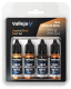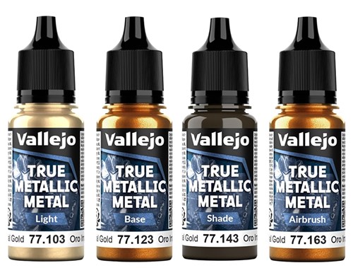 Vallejo TMM (True Metallic Metal) 4-pakning er akrylmaling utviklet for modell- og miniatyrmaling med pensel og airbrush. Settet inneholder fire kromatisk tilpassede metallfarger - Base, Shade, Light og Airbrush. Fargene er utviklet innenfor BSL-systemet og gir jevn finish, god dekkevne og konsistente resultater på metallflater. Malingen er klar til bruk rett fra flasken, men kan tynnes med Airbrush Thinner for mer subtile effekter.