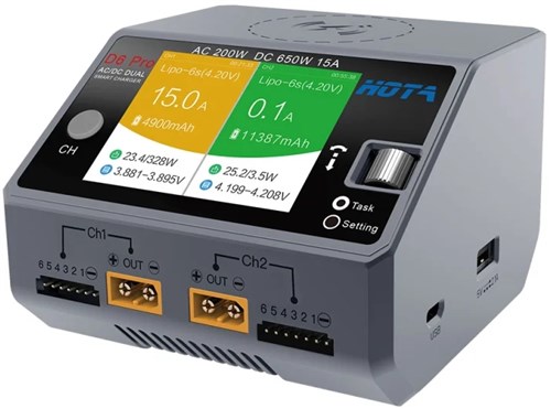 Hota her med en kraftig smartlader! D6 Pro har to porter og kan lade et bredt utvalg av støttede batterityper. Laderen kan lade fra 0,1-15A på hver av portene. Støtter lading av 1-6S LiPo/LiHv/LiFe/NiHm for å nevne noen av batteritypene. Du kan enten ta i bruk en ekstern powersupply med XT60 kontakt eller lading via 220V. Laderen kommer med en 2.8" IPS fargeskjem som gir deg god oversikt under lading.