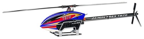 Align T-Rex TB70 er utstyrt med kraftig drivverk og to-blads halerotor, ramme i 3K karbon, redesignet landing skid som er lett og holdbart og ikke minst justerbart tail drive belt som er lett og utrolig sterkt! Batteriene monteres på skinne som slides inn i karbonkroppen og medfølgende elektronikk følger samme høye standard. V2-versjonen kommer med nyere motor, forsteret understell, forbedret canopy, enda bedre servoer og et mer effektivt drive belt design.
