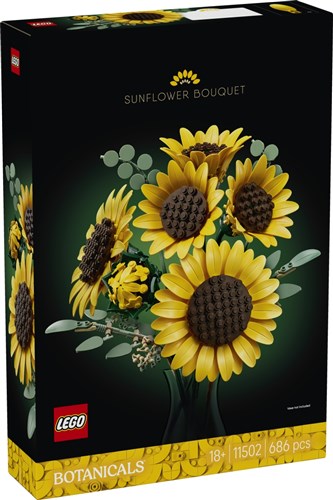 La kreativiteten blomstre med byggesettet LEGO Botanicals Solsikkebukett (11502) for voksne. Denne vakre LEGO buketten består av seks solsikker i ulike utviklingsstadier. Bygg en solsikkeknopp, tre solsikker som så vidt har begynt å blomstre, to fullt utsprungne solsikker og fire eukalyptus-stilker. Disse LEGO blomstene er svært realistiske, og med justerbare kronblader og stilker kan spirende blomsterdekoratører skreddersy buketten slik de vil og stille den ut som blomsterdekorasjon. Settet består av 686 deler.