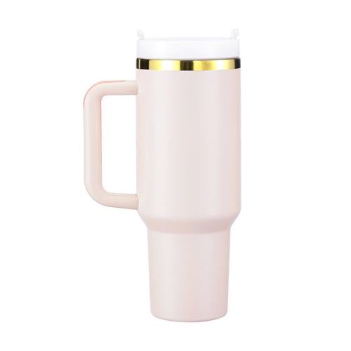 Tumbler i stål som er laget for lasergravering ved bruk av CO2-laser eller diode-laser. Ved gravering skifter fargen fra rosa til gull.